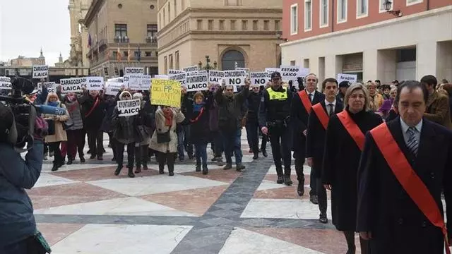 La asociación Movimiento hacia un Estado Laico (MHUEL) cumplió con su particular tradición en San Valero de protestar junto a la catedral de la Seo la comitiva del ayuntamiento «con la presencia de cargos públicos que acuden en procesión a la misa pontifical en honor al santo», explicó el portavoz, Jorge García, acompañado por decenas de personas que criticaron el paso de una procesión en la que solo estaban ocho concejales del PP. Junto a quienes protestaban, un compañero de corporación, el concejal de Zaragoza en Común Alberto Cubero. «Cuando están en representación de todos, con banda y estandarte, no respetan la aconfesionalidad», añadió García.