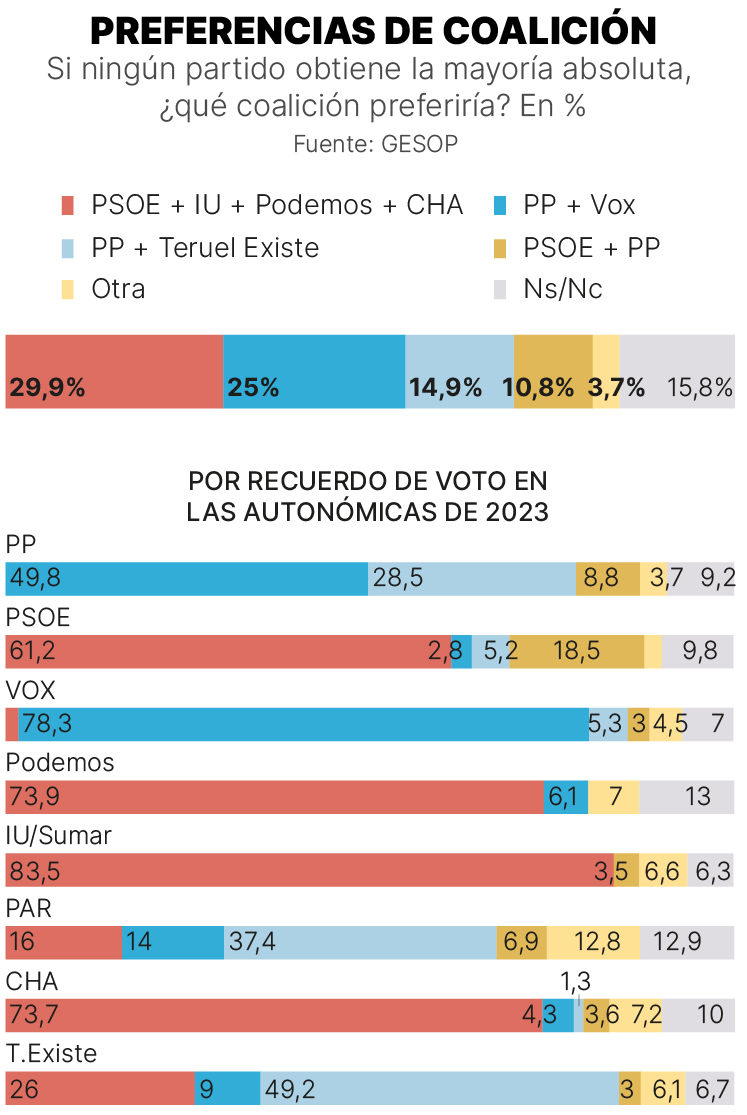 Esta es la opción con más apoyos en este sondeo, superando la que parece, a priori, la única válida después del 8F según todas las estimaciones hasta ahora: la coalición PP-Vox. Siendo los únicos que obtendrían esa mayoría absoluta necesaria en el Parlamento, es la opción preferente para el 25% de los encuestados, por detrás de ese cuatripartito de izquierdas. Aunque saca una importante diferencia a una alianza PP-Teruel Existe que entre los electores solo para el 14,9% sería la opción prioritaria. Una cuarta posibilidad planteada entre los encuestados se queda muy por debajo de estos apoyos, la de una hipotética alianza PP-PSOE. Solo el 10,8% de los encuestados ven esta posibilidad como la que más les gustaría.
