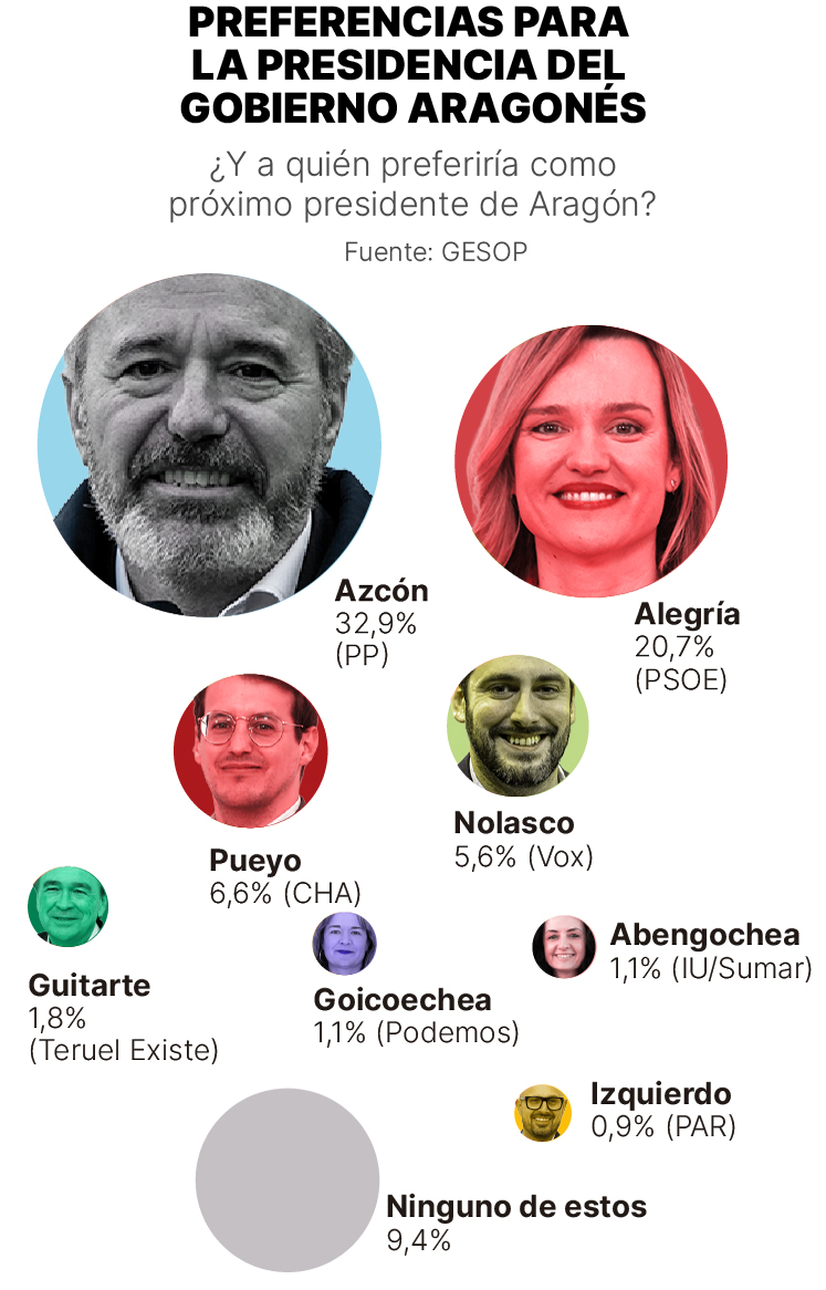 Otro análisis independiente es el que se puede hacer de a quién prefieren los aragoneses para que sea su próximo presidente del Gobierno, una valoración en la que sobresale el candidato del PP aragonés y actual dirigente autonómico, Jorge Azcón, que sería la opción prioritaria para el 32,9% de los encuestados en el sondeo de GESOP para EL PERIÓDICO DE ARAGÓN.