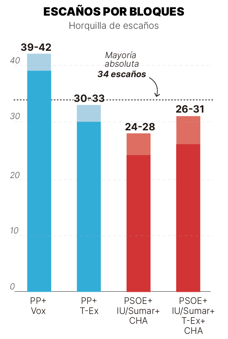 Así, la foto que arrojarían las urnas sería similar a la del adelanto electoral en Extremadura, donde la presidenta del PP María Guardiola también depende de Vox para poder seguir gobernando. En Aragón, la suma de PP y Vox se quedaría entre los 39 y los 42 diputados, en función de la suma de la horquilla más baja o más alta que les otorga la encuesta de GESOP.