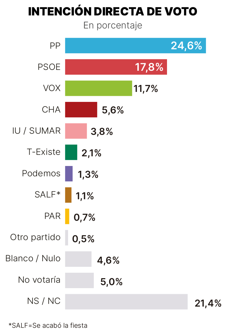 Según la intención directa de voto, el PP lograría un 24,6% de sufragios, seguido por el PSOE, siete puntos por debajo (17,8%) y con Vox en el 11,7%. CHA sería la cuarta fuerza política en intención directa de voto (5,6%), seguida por IU-Sumar (3,8%) y Teruel Existe (2,7%). Así, el Parlamento aragonés pasaría a tener seis fuerzas políticas, dos menos que en las últimas tres legislaturas, reduciéndose ligeramente el habitual pluralismo político del hemiciclo autonómico.