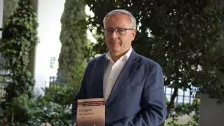 El escritor zaragozano José Ignacio Escudero posa con su primera novela: ‘Escúpele al pantano’, editada por Doce Robles. / LAURA TRIVES