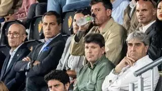 Mariano Aguilar, consejero del Real Zaragoza, junto a Txema Indias y Toni Acosta en el palco. / MIGUEL ÁNGEL GRACIA