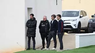 El central trabaja con el grupo mientras el director general y el nuevo director deportivo observan la primera sesión de David Navarro